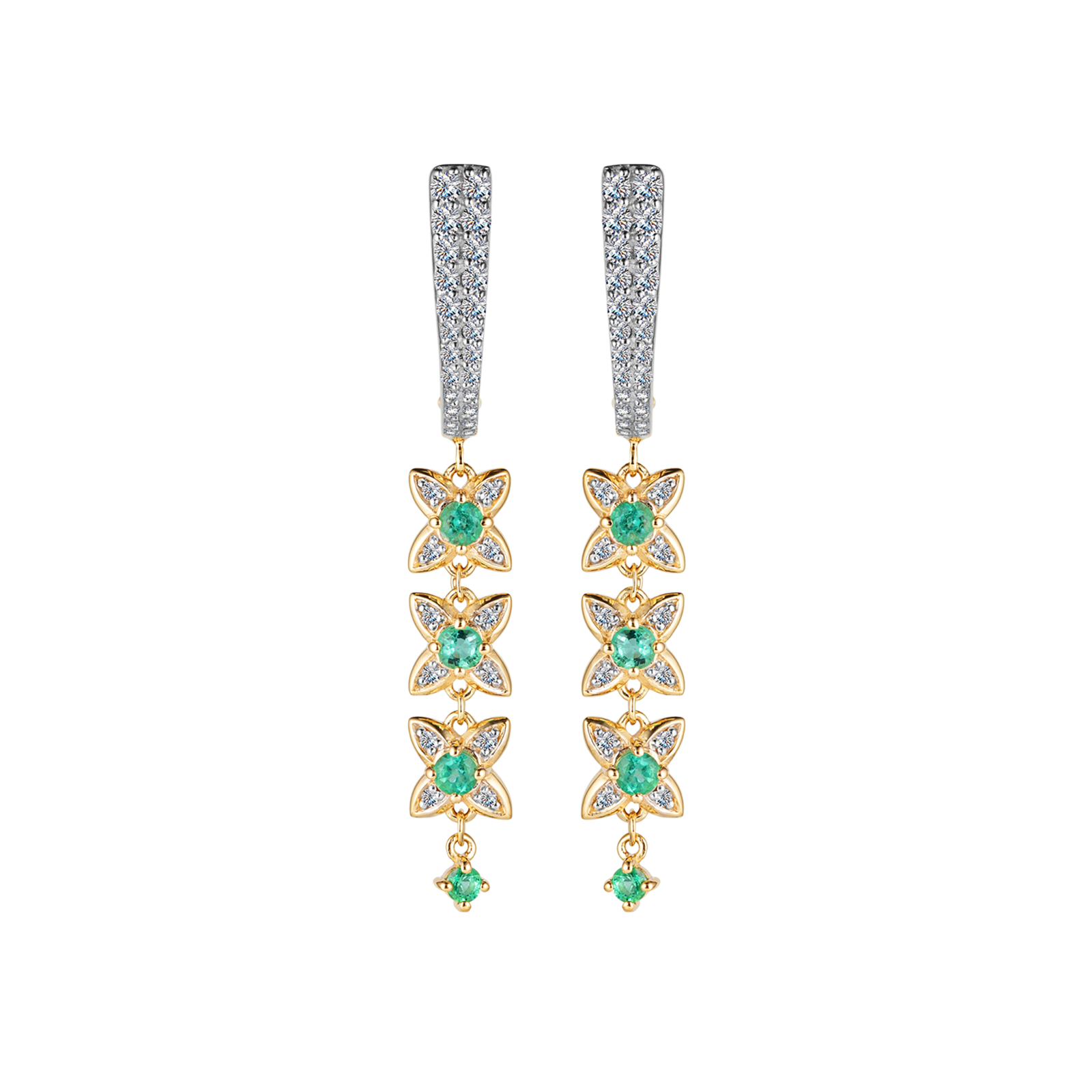 Длинные акцентные серьги с четырехлистниками, усыпанными бриллиантами, сочетают в себе изысканность и символику. Каждое ваше движение будет сопровождаться сиянием насыщенных изумрудов, зеленый оттенок которых добавит образу легкости и игривости.