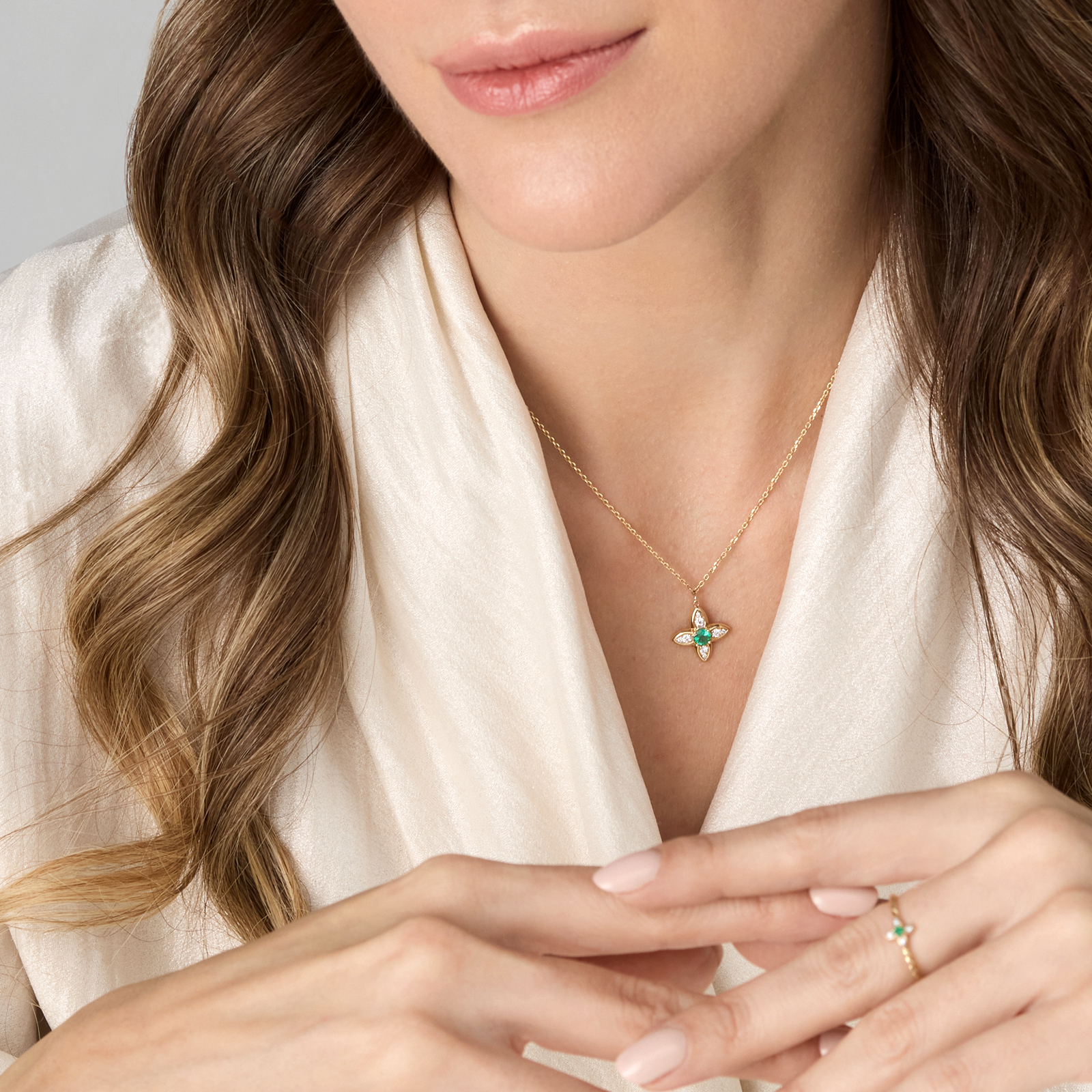 Акцентный четырехлистник, украшенный бриллиантами, объединяет в себе изысканность и символику. Изумруд с его насыщенным зеленым оттенком идеально гармонирует с теплым лимонным золотом, привнося в образ свежесть и элегантность.