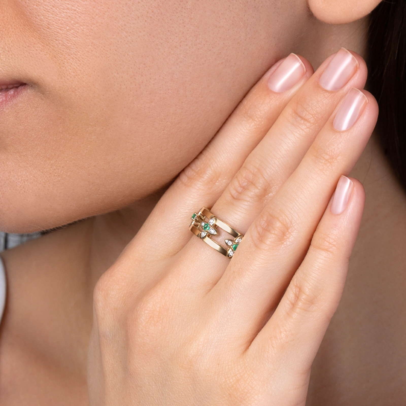 Уникальное двойное золотое кольцо с четырехлистниками в центре выглядит массивно, но благодаря продуманному дизайну не ощущается тяжелым. Это позволяет носить кольцо целый день, не замечая его веса, и наслаждаться комфортом. Маленькие изумруды в огранке круг идеально гармонируют с лимонным золотом, создавая яркий акцент в украшении.