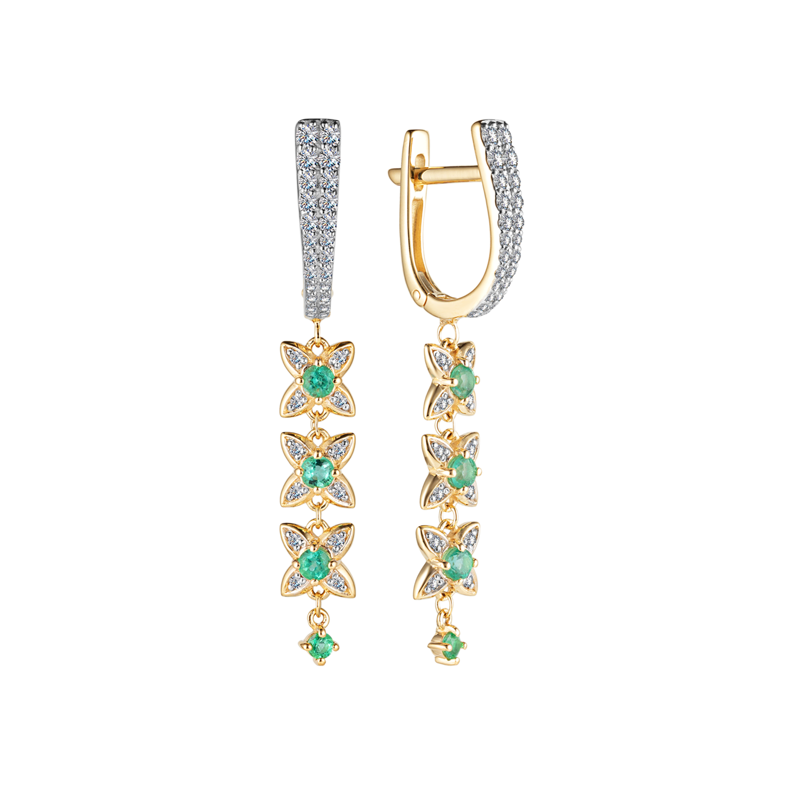 Длинные акцентные серьги с четырехлистниками, усыпанными бриллиантами, сочетают в себе изысканность и символику. Каждое ваше движение будет сопровождаться сиянием насыщенных изумрудов, зеленый оттенок которых добавит образу легкости и игривости.