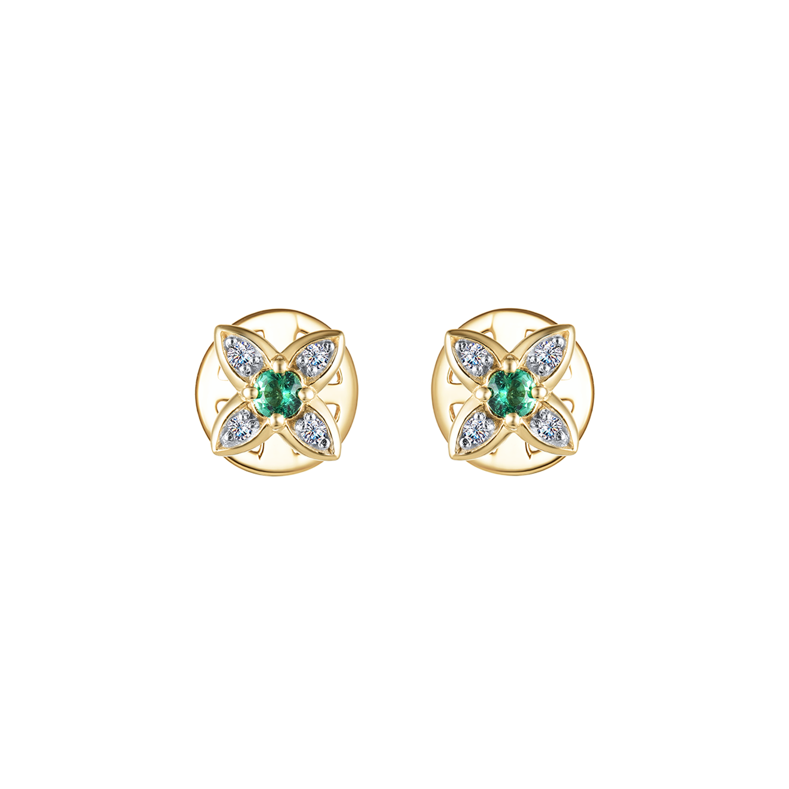 Очаровательные золотые пусеты-четырехлистники с бриллиантами и изумрудами в огранке круг станут вашим любимым аксессуаром, который можно носить весь день, не снимая.